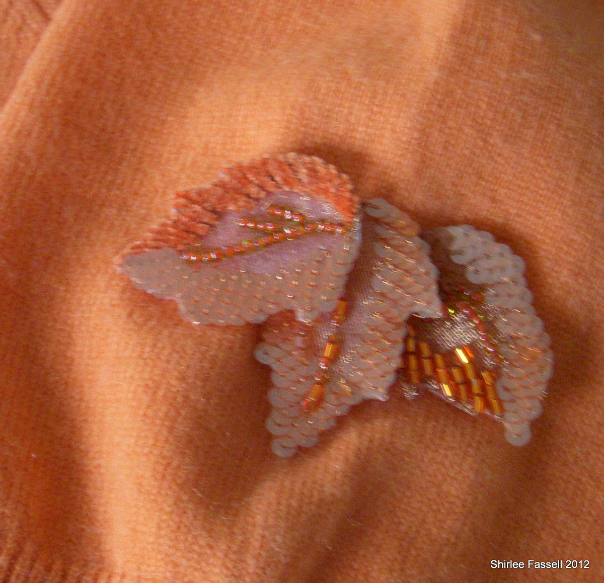 Flower and leaf adornments to wear on a sweater using SEQUINS, chenille, metal organza, and beads.